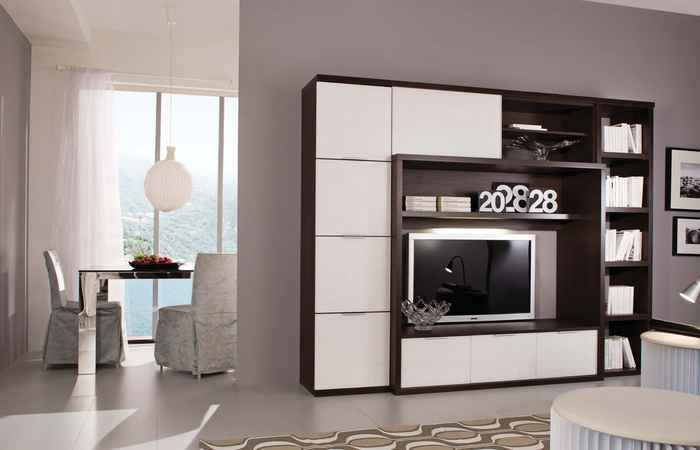 Демо №438. Дизайн гостиной комнаты совмещенной с кухней, встроенный шкаф купе в интерьере фото