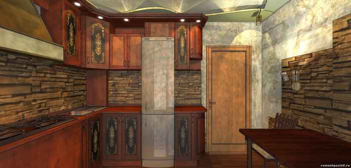 Демо №364. Декоративный камень в интерьере фото арка: угловая система хранения для кухни